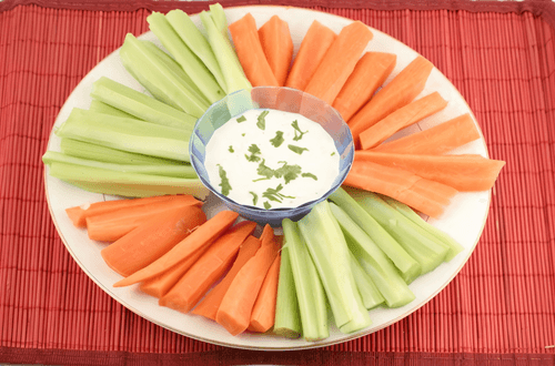 Place the container in the center of a large dish or on a tray, arranging sliced peppers around the edge, alternating colors, as well as greens and other vegetables.