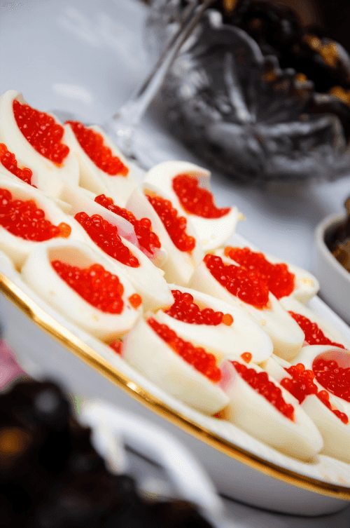 Eggs stuffed with caviar under mayonnaise are an exquisite dish of Russian cuisine that combines simplicity and luxury. It has roots in the traditions of royal feasts when caviar was considered a symbol of wealth. The delicate egg white filled with salty caviar creates a refined combination of flavors, while homemade mayonnaise adds a creamy texture. Fresh tomatoes, green onions, and dill add freshness and harmonize with the overall composition. The dish is perfect as an appetizer for a festive table; its aesthetic appearance and rich taste attract guests' attention. It is not just a culinary delight but also an immersion into the rich gastronomic culture of Russia, where attention to detail transforms ordinary ingredients into a masterpiece.