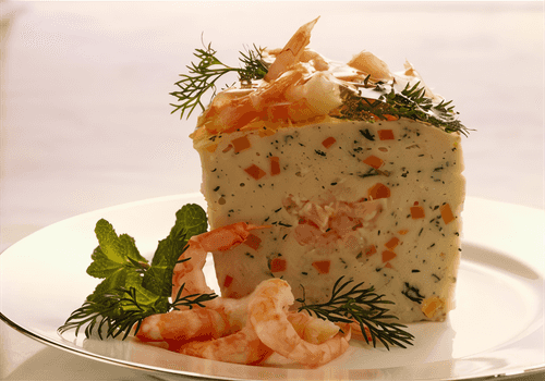English pâté is a refined and elegant dish of British cuisine that combines the creaminess of butter, the spice of garlic, and the sophistication of shrimp. Historically, pâtés were popular among the English aristocracy, served as appetizers at formal receptions. This version features an airy texture and harmonious flavor. The bright yellow layer of butter adds a special presentation to the pâté, creating a rich and intense taste. It is served with lemon slices and fresh parsley, adding freshness and lightness. Perfect as an elegant appetizer for festive tables or evening tea with crispy toasts.