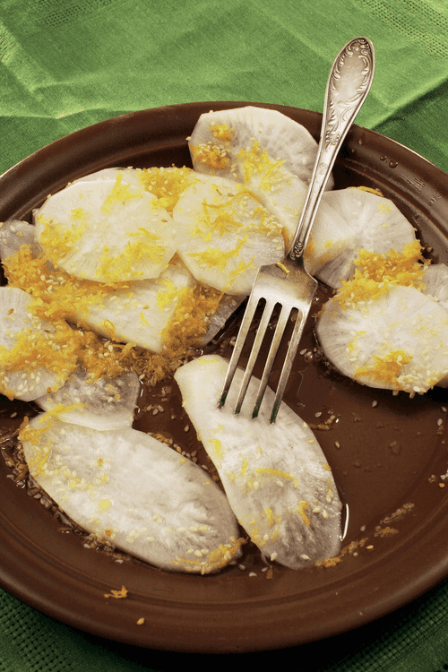 Layer the radish in a deep dish, pour with a sauce made of rice vinegar and cane sugar, and generously sprinkle with lemon zest and toasted sesame seeds.