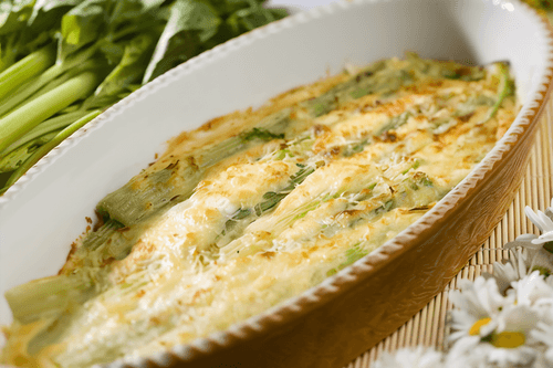 Celery with cheese is a simple yet exquisite dish that beautifully conveys the spirit of Russian cuisine. The tender hearts of celery, first carefully prepared and boiled, become soft while retaining their characteristic light freshness. They are then baked with Gruyère—a cheese with a rich nutty flavor that melts to form an appetizing golden crust. Butter adds tenderness and depth of flavor to the dish. This treat can serve as an elegant appetizer or a side dish for meat and fish dishes, and its rich aroma makes it a true delicacy. The recipe recalls classic European vegetable baking techniques but with a unique Russian flair.