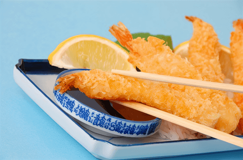 Coat the shrimp in flour, dip in beaten egg, and fry for 5 minutes in hot oil.