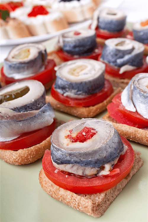 Place a slice of tomato on each piece of bread. On top, add a piece of herring rolled into a circle. Inside the circle, you can optionally add an olive or a small piece of sweet red pepper.