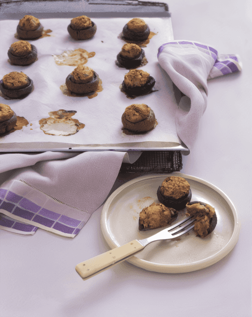 Grease the baking dish with oil, place the caps smooth side down, season with salt, and fill with sautéed legs and onions, sprinkle with breadcrumbs. Mix the wine with the broth and pour it into the dish with the mushrooms. Bake for 10 minutes at 190 degrees and serve immediately in the same dish.