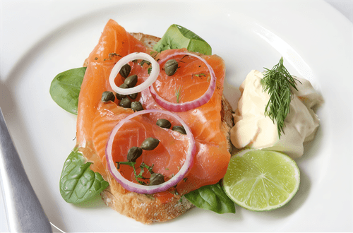 Remove excess brine from the salmon. Cut into 24 equal pieces. Arrange the fish in a fan shape on pre-chilled plates. Before serving, add a spoonful of cream to each plate. Garnish with onion and lemon.