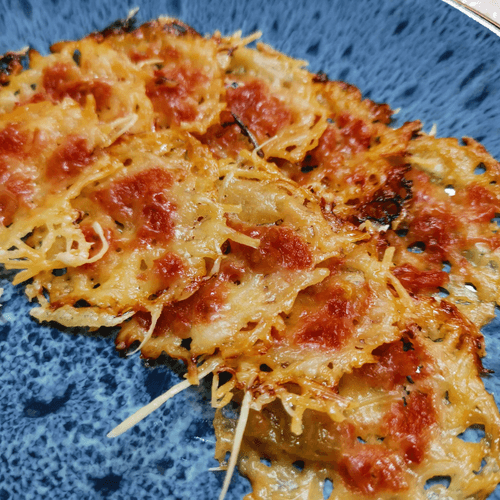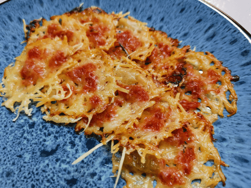 Spicy goat cheese chips are a bold combination of zest and tenderness. This signature recipe blends the tangy flavor of goat cheese with the fiery kick of sriracha and spicy tomato sauce. The crispy texture achieved by baking makes them an ideal snack for gourmets who love spicy notes. The light saltiness of parmesan adds sophistication, while the garlic aroma gives depth to the flavor. These chips are perfect as a standalone treat or as an accompaniment to a glass of wine. The dish's origins lie in modern gastronomic experiments where classic ingredients are reimagined to create new taste experiences.