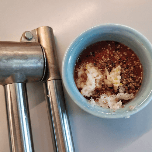 Press the garlic into the sauce using a press.