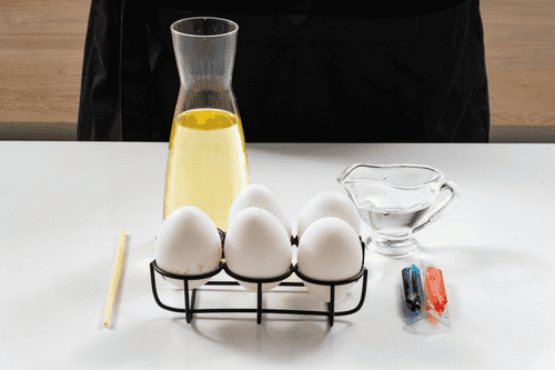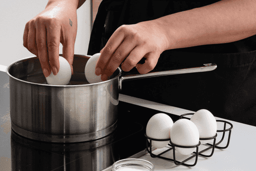 Boil the eggs hard. Cool the cooked eggs under running water, then dry them with a towel.