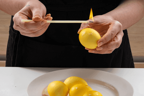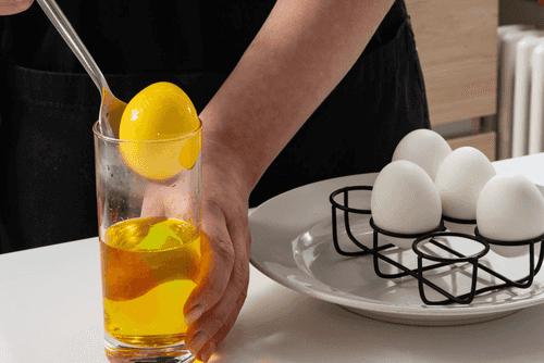 Dip the egg in dye and hold for 3 minutes. Do the same with the other eggs. Leave to dry.