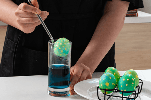 Prepare a second, darker dye. Dip the eggs one by one and hold them for 3-5 minutes.