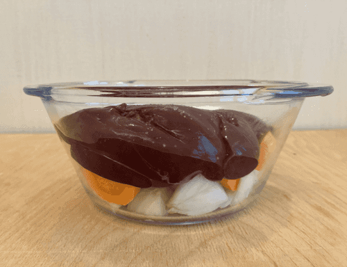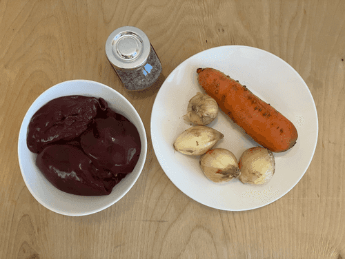 Wash and dry the liver. Layer onions and carrots at the bottom of a glass pot, salt and sprinkle with spices. Place the liver on top of the vegetables. Salt and sprinkle with spices.