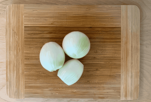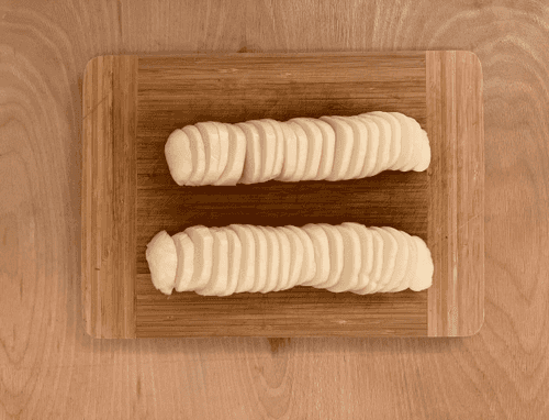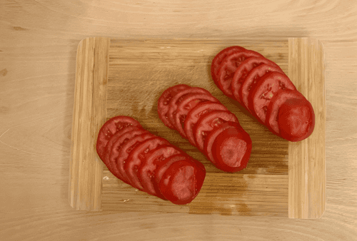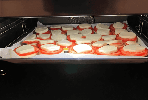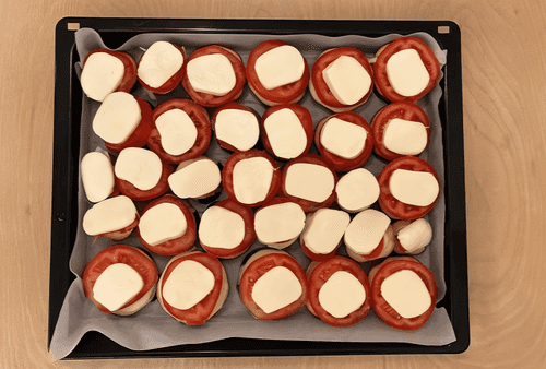 Lay out the circles of eggplant. On top of the eggplant, place the circles of onion. On top of the onion, place the circles of tomato. Finally, place the circles of cheese on top.
