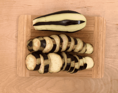 Wash the eggplants, peel them in strips with a 1 cm gap, and cut into circles 1 cm thick.