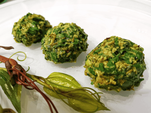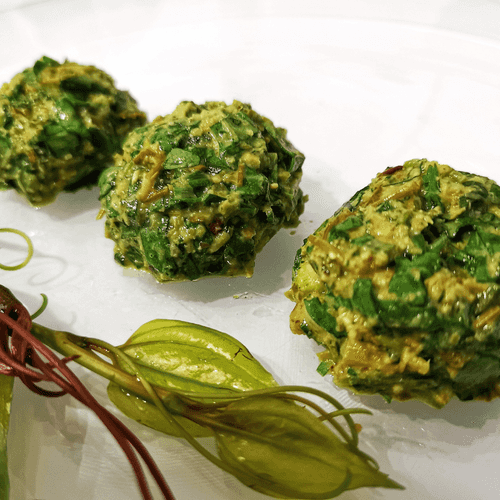 Pkhali from ekala is a traditional Georgian dish that embodies the harmony of greens, nuts, and spices. Its roots trace back to ancient culinary traditions of the Caucasus where pkhali serves as an important part of the feast. Ekala, a fragrant green herb, undergoes boiling and is then mixed with cilantro, arugula, garlic, and lemon juice to create a rich flavor with a slight tanginess. Pine nuts add nutty depth and a delicate texture to the dish. The resulting mixture is shaped into appetizing balls that are perfect as an appetizer. Pkhali from ekala is served with traditional Georgian bread or as part of a festive assortment, enriching the meal with freshness and natural taste. It is not just food but a small gastronomic story conveying the spirit of Georgian cuisine.