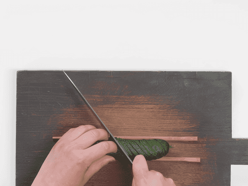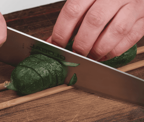 Turn the cucumber cut side down, also between the sticks. Cut it while holding the knife slightly diagonally.