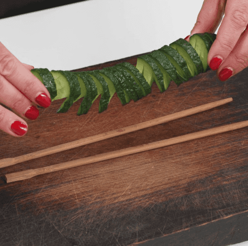 Place the cucumber on the cutting board and lay the chopsticks along it.