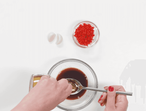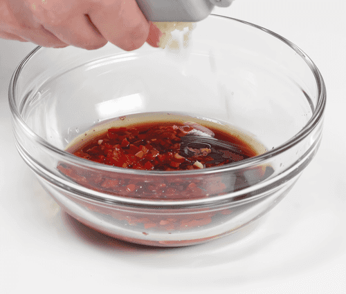 In a bowl, mix rice vinegar, soy sauce, chili, sugar, and sesame oil until the sugar dissolves.