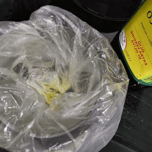 Place the plastic bag in a cup and grease the inside with olive oil.