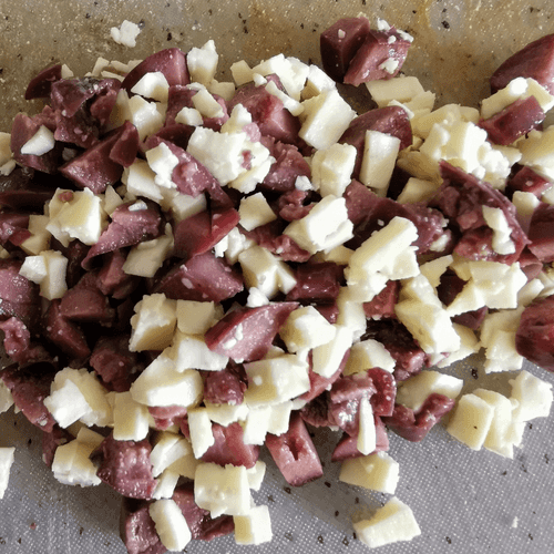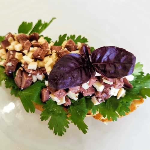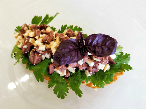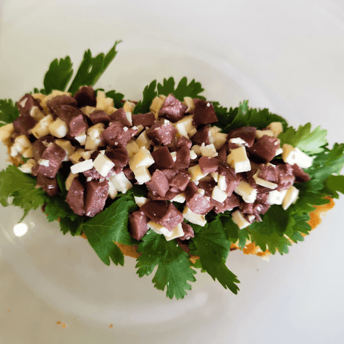 Bruschetta with olives and cheese is a refined appetizer with Mediterranean notes, combining crispy ciabatta, tender Adyghe cheese, and tangy Kalamata olives. Inspired by Italian culinary traditions, it has gained an authorial interpretation where the freshness of parsley and aromatic basil provide a harmonious finish to the dish. The easy preparation method makes it an ideal choice for a cozy breakfast or festive table. The taste of bruschetta is a delicate balance of creamy softness of cheese, salty richness of olives, and the crunchy texture of toasted bread. It is delightful as a standalone dish or accompanied by a glass of white wine. Its tenderness and richness captivate from the first bite, leaving a pleasant aftertaste and a desire to enjoy it again.