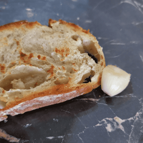 Rub the bread with a clove of garlic on both sides.