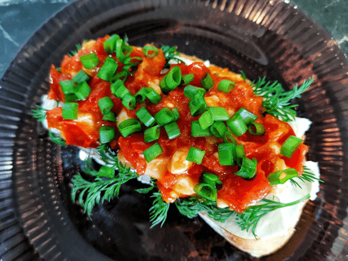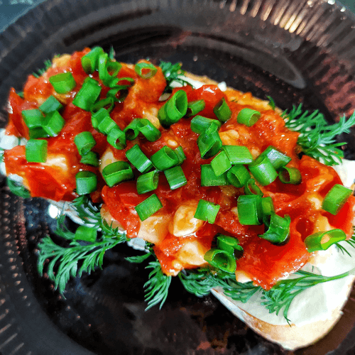 Брускетта с помидорами черри и мягким козьим сыром – это изысканное сочетание хрустящего хлеба, насыщенных томатов и нежного сыра, создающее гармонию вкусов. Этот рецепт вдохновлён итальянскими традициями, где брускетта – символ уютных застолий и наслаждения простыми, но качественными ингредиентами. Сладковатые черри, тушённые до мягкости, приобретают насыщенный вкус, а сливочный козий сыр придаёт нежность и утонченность. Сметана и свежий укроп добавляют легкую кислинку и аромат свежести, делая закуску ещё более сбалансированной. Идеально подходит для дружеских встреч, аперитивов или лёгкого перекуса с бокалом вина. Подавать с мелко нарезанным зелёным луком, который освежает и подчёркивает насыщенность вкуса.