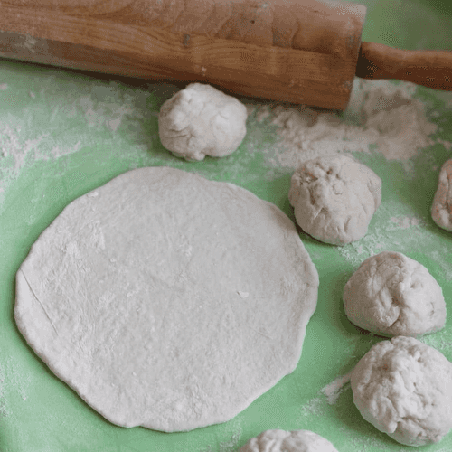 Roll each ball into a thin flatbread with a diameter of 20-25 cm. Lightly dust the silicone mat with flour to prevent the dough from sticking.