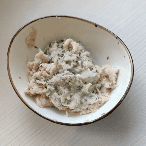 Puree the onion with dill in a blender. Add the mixture to the chicken mince and mix thoroughly until homogeneous. Season with salt and pepper to taste.