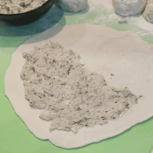 Spread the minced meat only on one half of the rolled-out flatbread. Spread it in a thin layer, leaving a 1.5–2 cm edge.