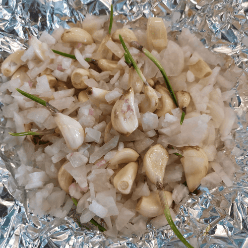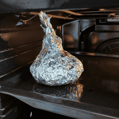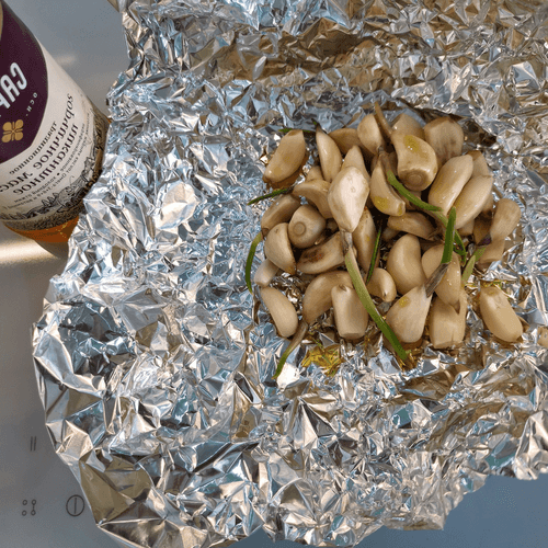 Wrap the foil and send it to a preheated oven at 180 degrees.
