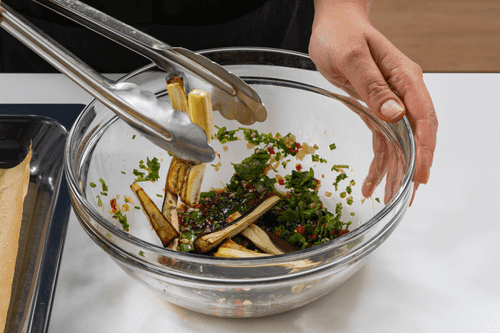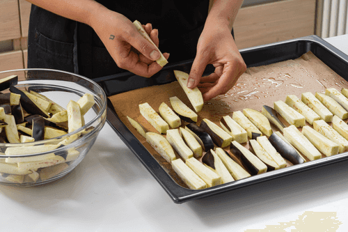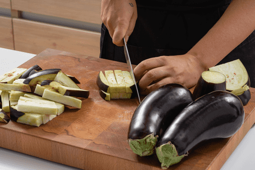Cut the eggplants into strips.