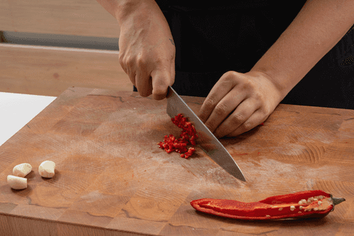 Finely chop the chili (you can remove the seeds to make it less spicy) and garlic.