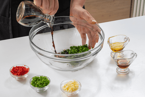 In a large bowl, mix the chopped ingredients. Add soy and fish sauces, sesame oil, and stir.