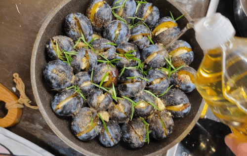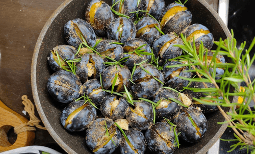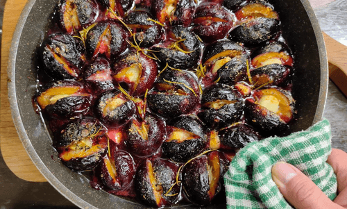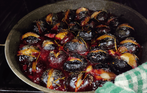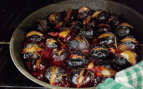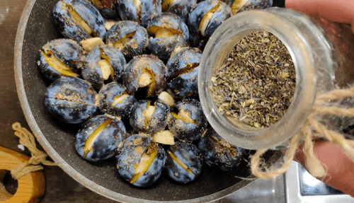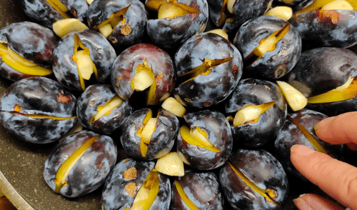 Place a clove of garlic in each plum instead of the pit. If there is leftover garlic, add it between the plums.