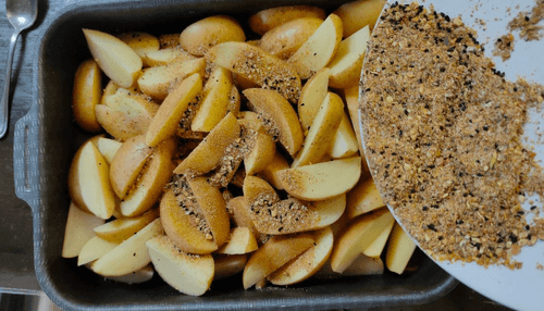 Rustic potato with sesame is a dish filled with the aroma of country cuisine, simplicity, and rich flavor. Baked potatoes covered with a golden crust are enriched with a mix of spices, garlic, and sesame, creating a delightful combination of textures and tastes. The recipe has its roots in Russian rural cuisine where simple and accessible ingredients turn into true culinary masterpieces. The dish's feature is the crispy crust combined with a soft, crumbly center and the spicy taste of garlic and ucho-suneli. It is perfect as an independent treat or as a side dish to meat or fish, filling the meal with coziness and home warmth.