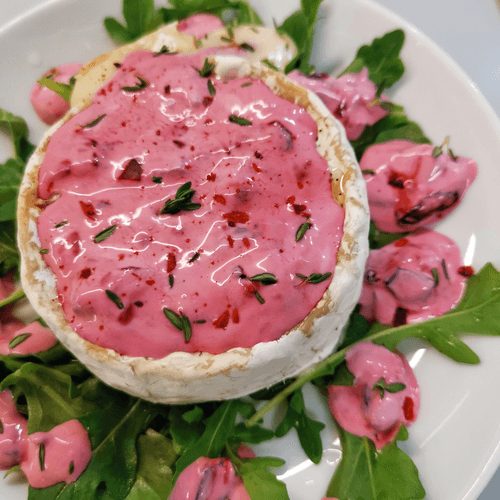 Brie cheese with berry cream is an exquisite combination of creamy cheese with delicate berry sauce, complemented by the freshness of arugula and the aroma of thyme. Baked until soft, brie reveals its rich flavor, while the sweet-sour honeysuckle berries combined with sour cream add a tender creamy texture. Olive oil and spices provide depth, while chili flakes add spiciness. This signature recipe embodies a harmony of flavors and is an excellent choice for both a romantic dinner and a festive table. Serving with greens makes the dish not only aesthetically appealing but also refreshing. Enjoy its rich aroma and melting texture, creating a unique gastronomic experience!