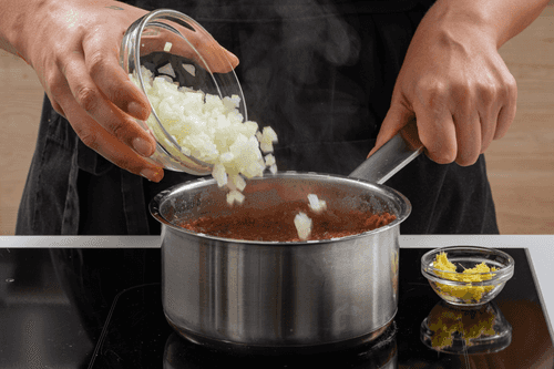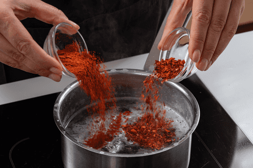 When the mixture thickens, pour in soy sauce and add chili and paprika.