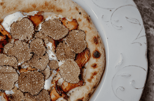 Stuff the flatbread with truffle cream cheese, top with stracciatella and chanterelles, and drizzle with truffle oil. Return to the oven for 5-7 minutes.