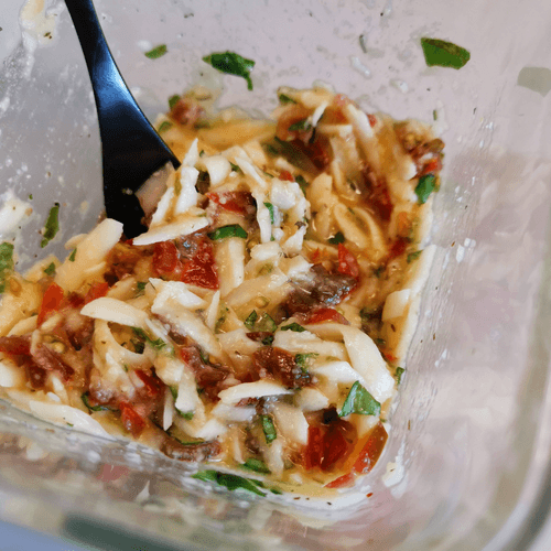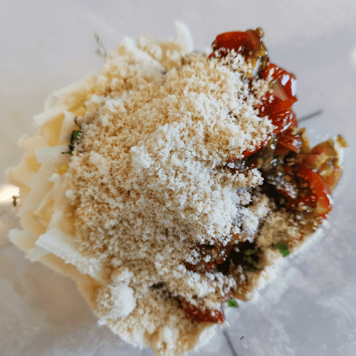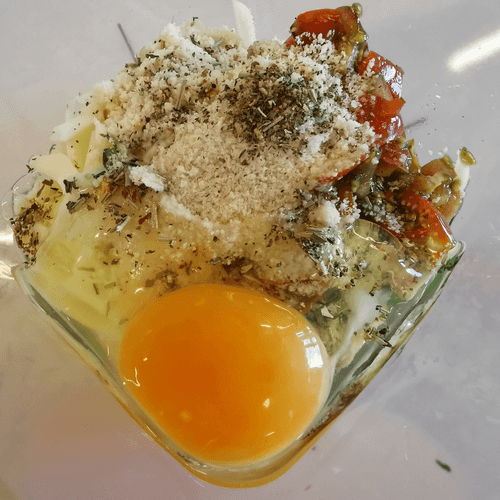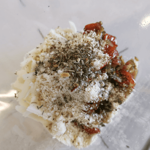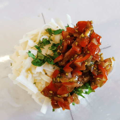 Grate the cheese and mix it with herbs and tomatoes.
