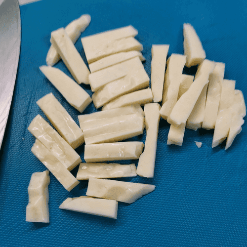 Cut the cheese into slices about 1.5 cm thick.