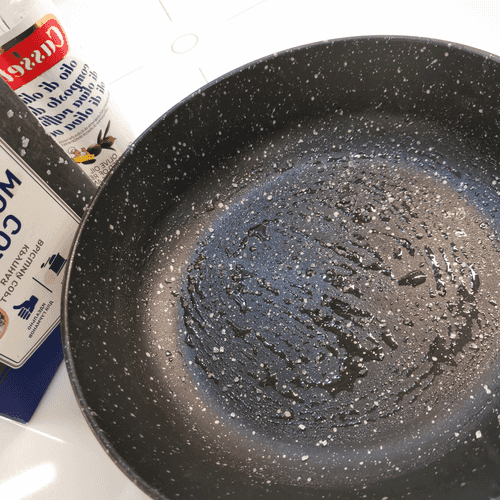 Grease the pan with olive oil and place it on high heat, adding a pinch of salt.