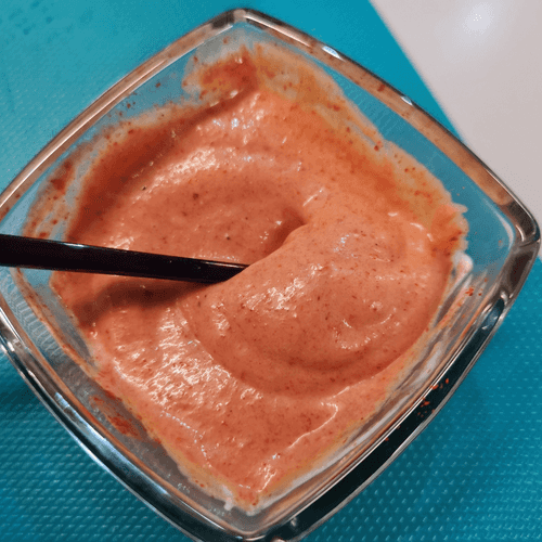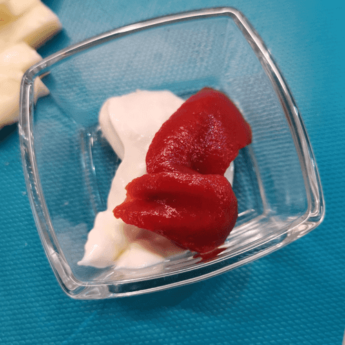 For the sauce, mix mayonnaise and tomato paste.