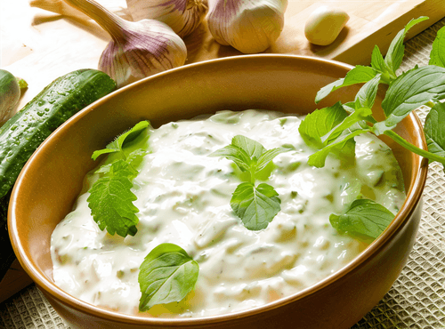 Peel and chop the garlic cloves. Mix the garlic, cucumber, yogurt, olive oil, and vinegar.
