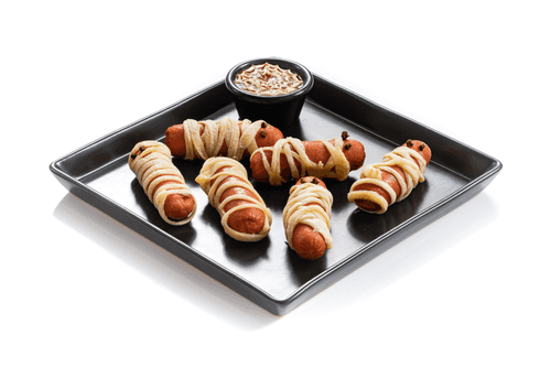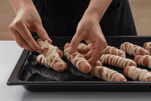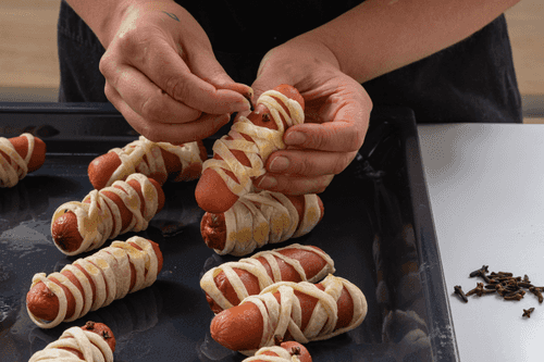 You can draw eyes on ready-made sausages with ketchup or make them from other available products, like black pepper or clove buds (in this case, guests should be warned not to eat them).
