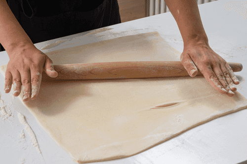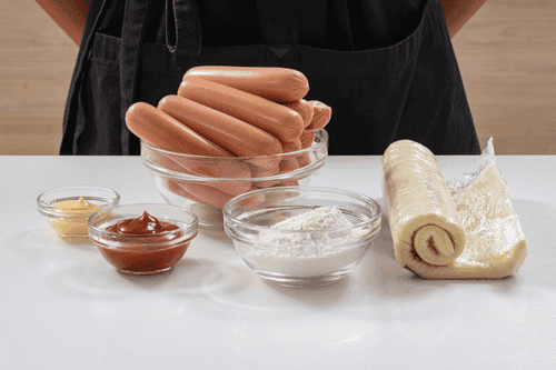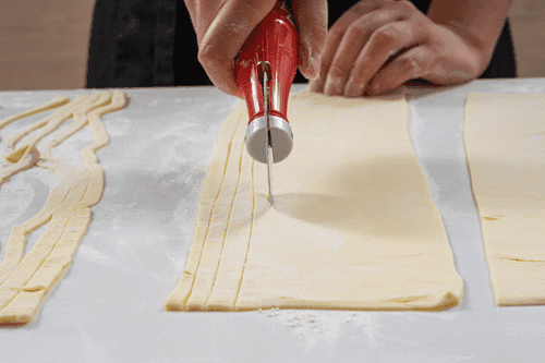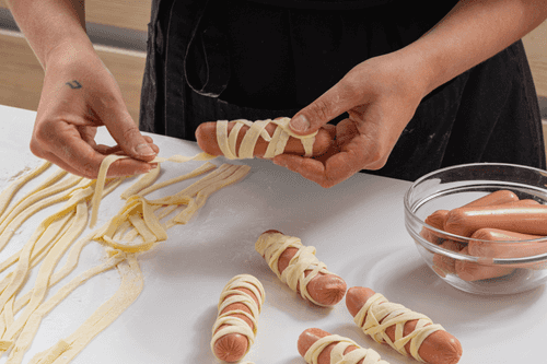 Cut the dough into thin strips according to the number of sausages. For convenience, a pizza cutter can be used.