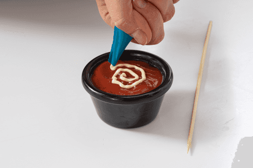 Pour ketchup into a sauce dish, then squeeze cheese sauce in a spiral. Use a toothpick to create a web pattern on the sauce.