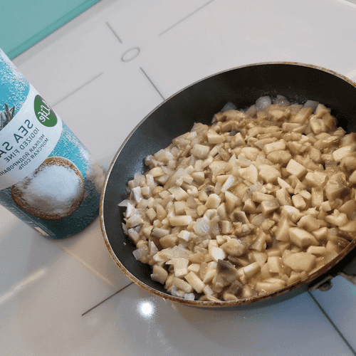 Send mushrooms and onions to heated butter in a pan, salt, and fry, stirring occasionally, for 5 minutes over medium heat.