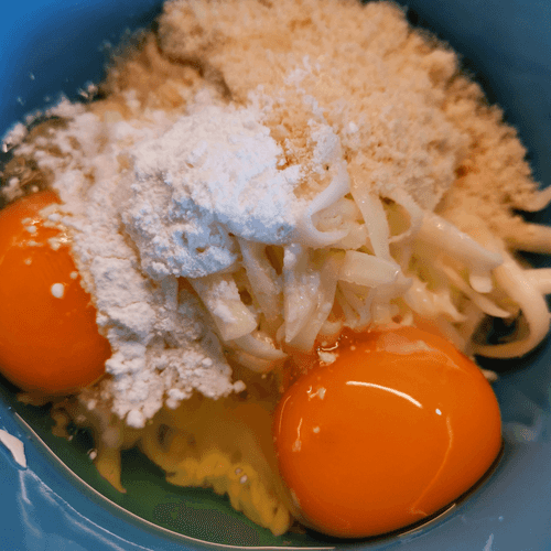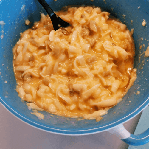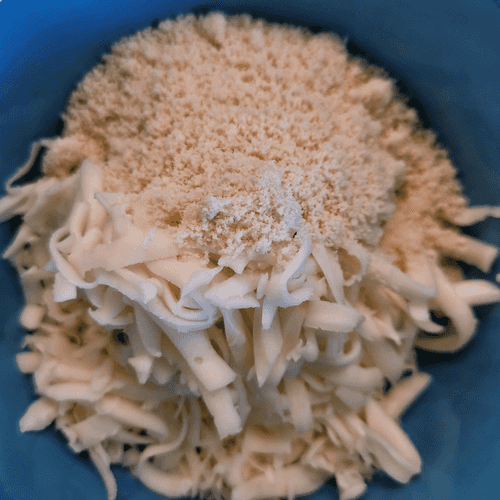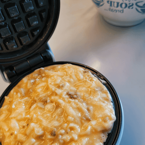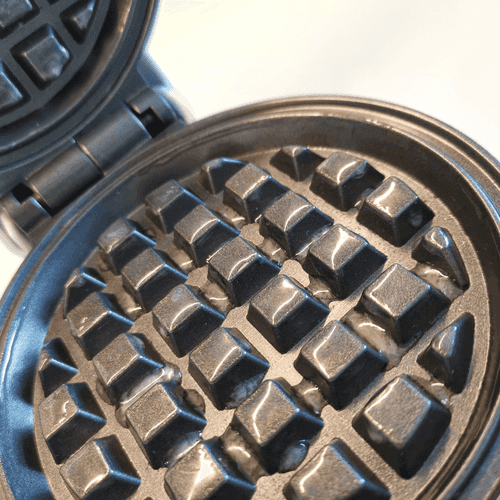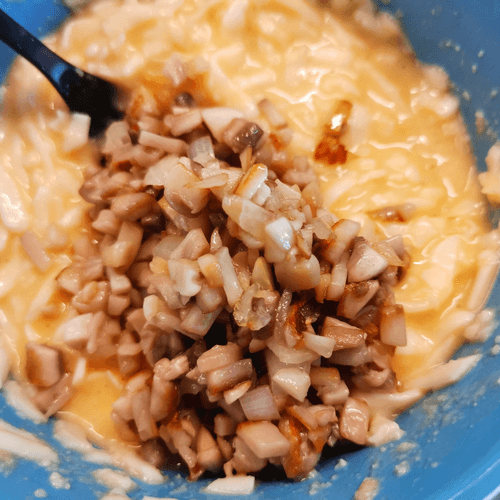 Place the cheese-mushroom mixture in the waffle maker and bake for about 3-5 minutes. The exact cooking time depends on the device's power.