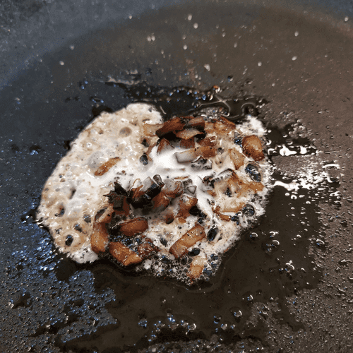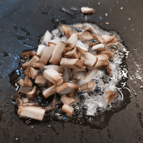 Fry the mushrooms and onions in oil.
