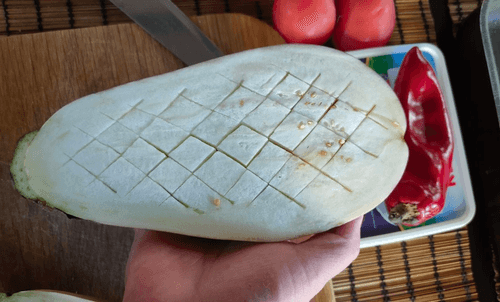 Next, make grid cuts not all the way through, but only halfway into the flesh of the eggplant.