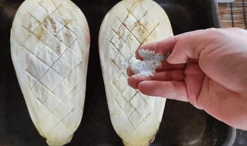 Place the eggplant halves in a baking dish and salt them.